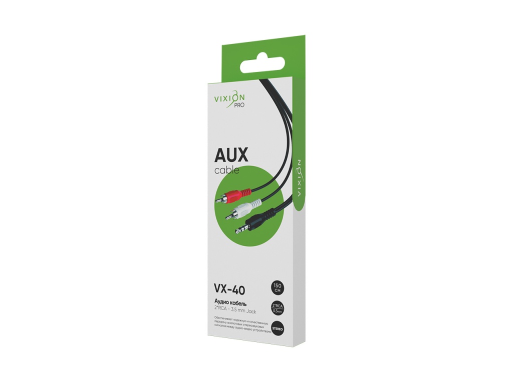 Кабель VIXION PRO VX-40 поможет подключить аудиотехнику к усилителям и телевизорам, подойдет для передачи аналогового аудиосигнала. Устройство оснащено двумя разъемами 2RCA (M) - Jack 3,5 (M). Кабель позволит соединить устройства на расстоянии до 1,5 метров. Оплетка защитит VX-40 от изломов и повреждений. Выполнен в черном цвете.