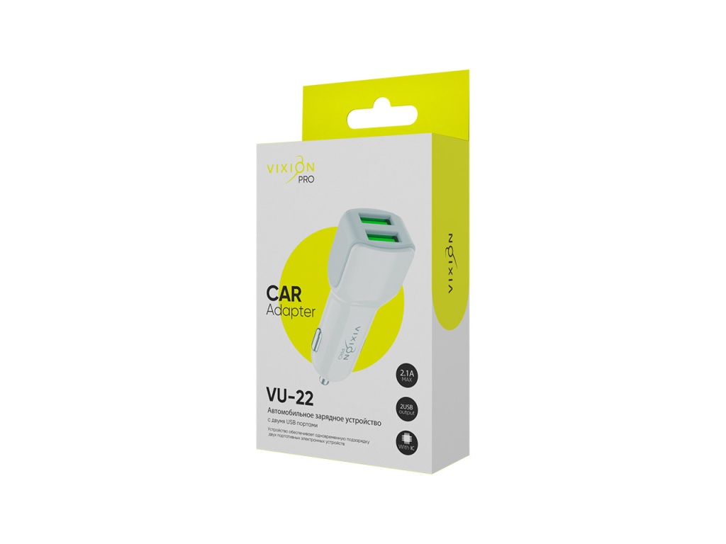 Автомобильное зарядное устройство VIXION станет незаменимым помощником тем, кто проводит за рулем достаточно много времени. Модель VIXION PRO VU-22 обеспечит безопасную зарядку вашему девайсу от аккумулятора машины. Подходит для всех видов автомобилей, оборудованных прикуривателем, с входным напряжением от 12 до 24 Вольт. Имеет стильный внешний вид, выполнен в белом глянце. Аксессуар компактен, функционален, долговечен и надежен. Два USB-порта позволят зарядить сразу несколько устройств одновременно.