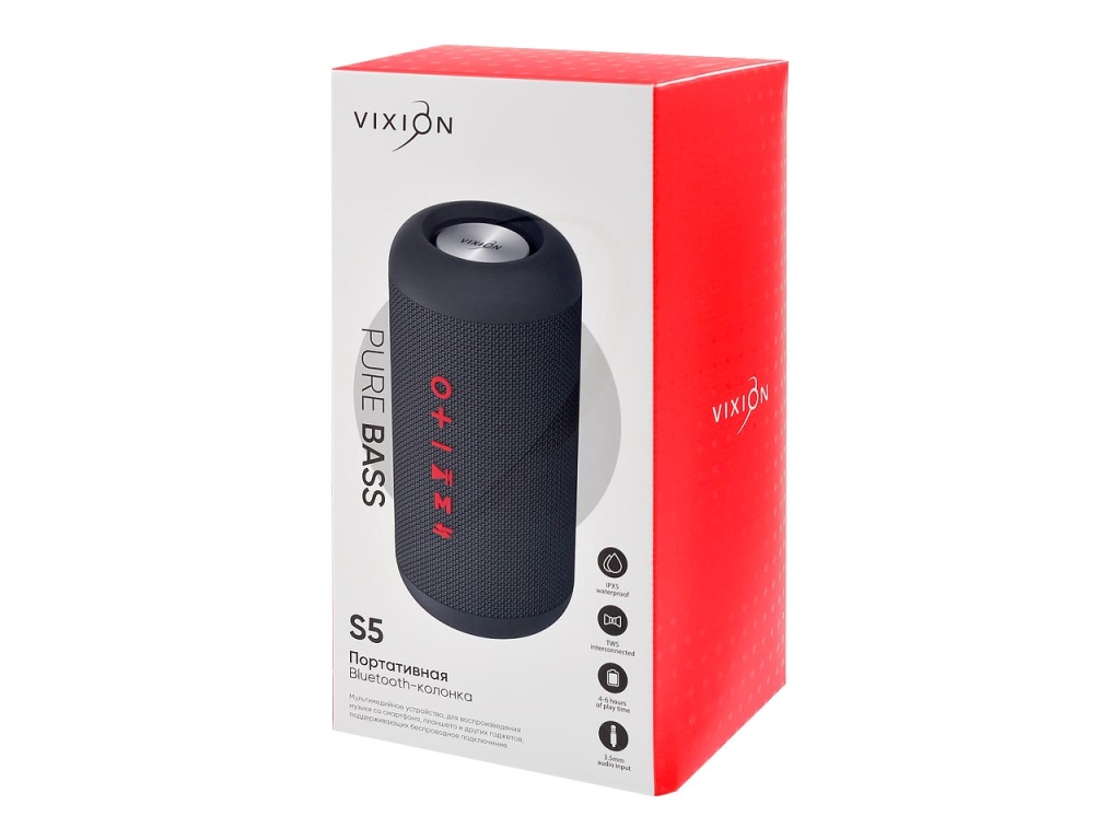 Портативная Bluetooth-колонка VIXION S5 - мультимедийное устройство, которое подойдет для воспроизведения музыки со смартфона, планшета и других гаджетов, поддерживающих беспроводное подключение. Степень влагозащиты - IPX5 (защищено от струи воды). Колонка имеет цилиндрический черный корпус с мягкими Soft-touch вставками по краям. К ней прикреплен небольшой шнурок для удобного удерживания ее во время движения или переноса с места на место. В комплекте имеется кабель AUX для подключения.