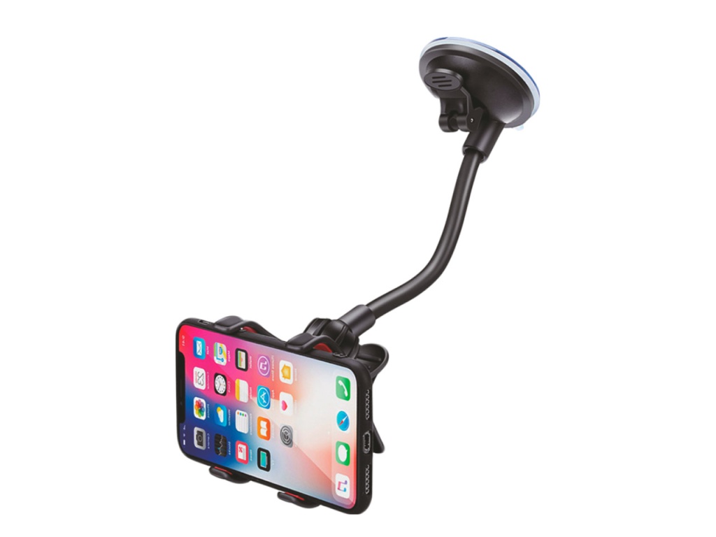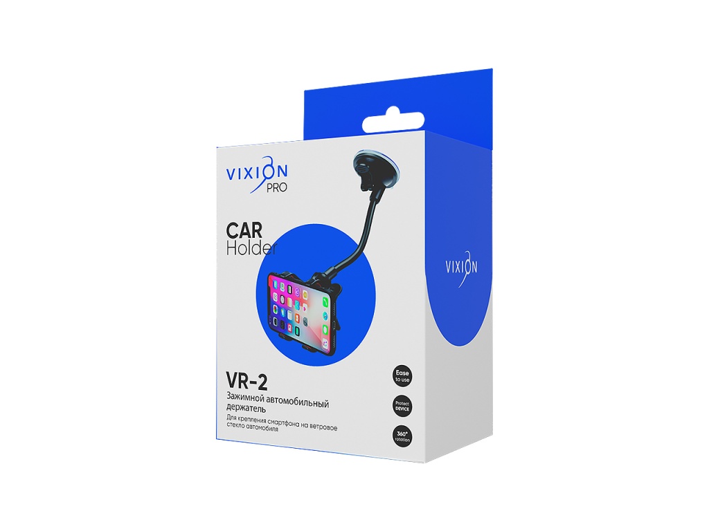 Держатель предназначен для фиксации смартфона механизмом «прищепка». Она позволяет надежно удерживать устройство, а мягкие внутренние накладки на зажимах помогают избежать царапин. Гибкая штанга легко принимает заданное положение, с ее помощью можно приближать или отдалять устройство от автомобилиста. Крепится данный аксессуар на лобовое стекло машины при помощи присоски. Устройство обладает функцией поворота на 360°, позволяет расположить девайс в максимально удобном для вас положении. Держатель VIXION PRO VR-2 выполнен в сдержанном черном цвете, подойдет для салона любого автомобиля.
