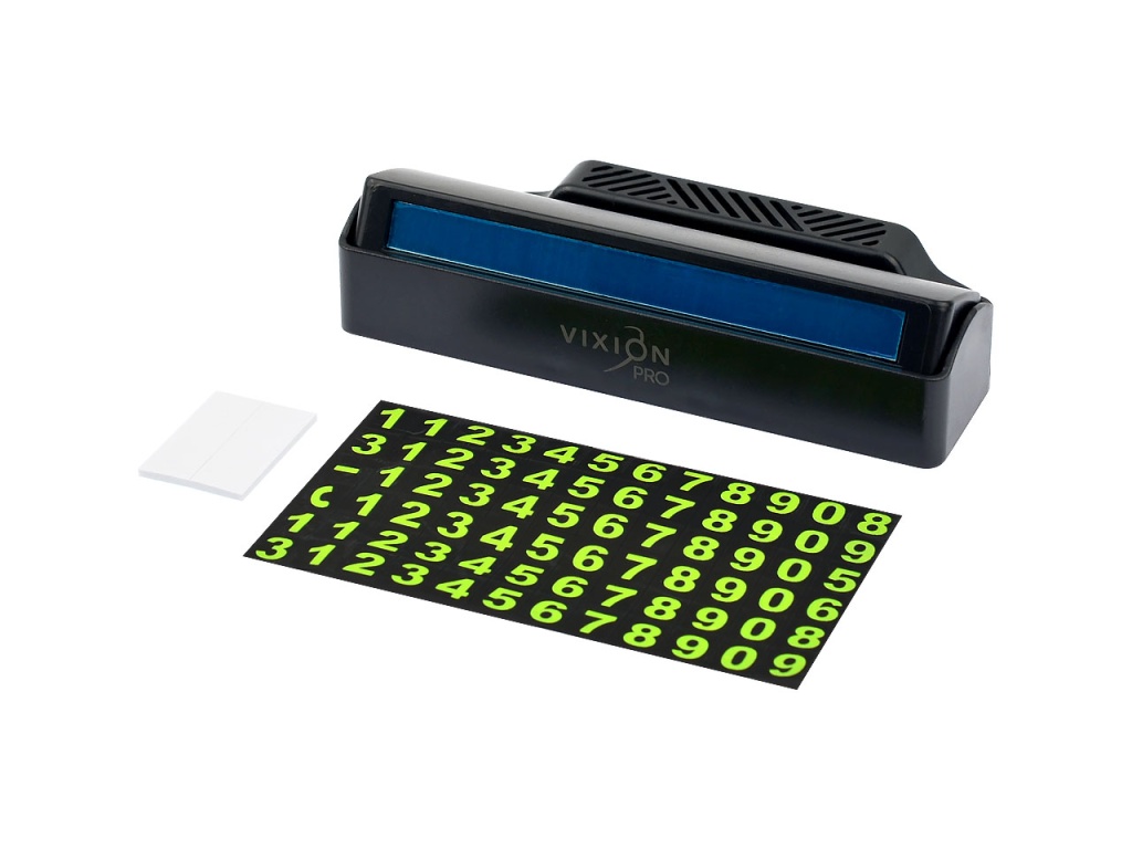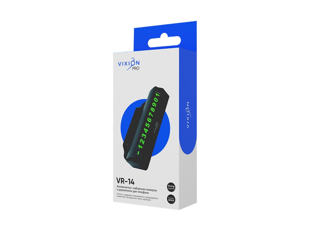 Автовизитка VIXION PRO VR-14 — яркая и заметная деталь на передней панели автомобиля. Такая визитка не выцветет на солнце и долго прослужит своему владельцу. Оставляйте номер вашего телефона в припаркованном автомобиле: просто откройте табличку, и с вами всегда смогут связаться. Черная визитка эстетично впишется в интерьер любого авто. В комплекте VR-14 идут наборные цифры, которые легко крепятся на магнитное основание дисплея. Автовизитка имеет подставку под смартфон.