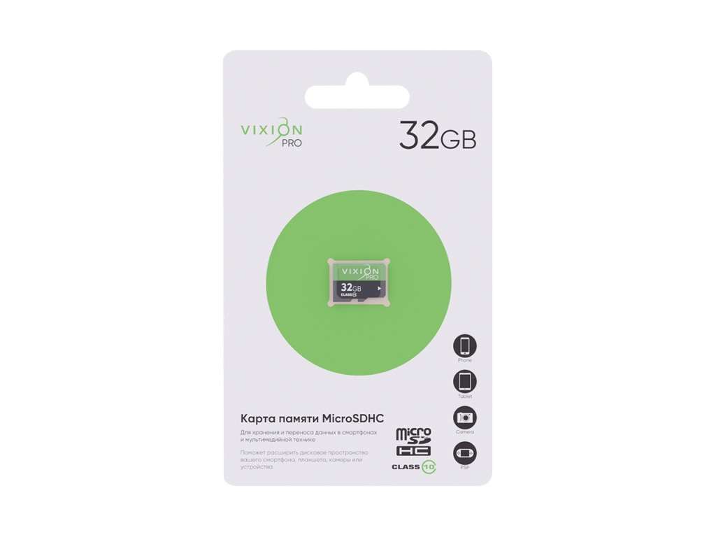 MicroSD VIXION PRO имеет 10-ый класс скорости. Сверхкомпактный формат помогает использовать этот аксессуар в самых разных устройствах: от миниатюрных девайсов до зеркальных фотоаппаратов и видеокамер. Кроме того, карты подходят для современных смартфонов, планшетов и других гаджетов. Объем карты памяти — 32ГБ.