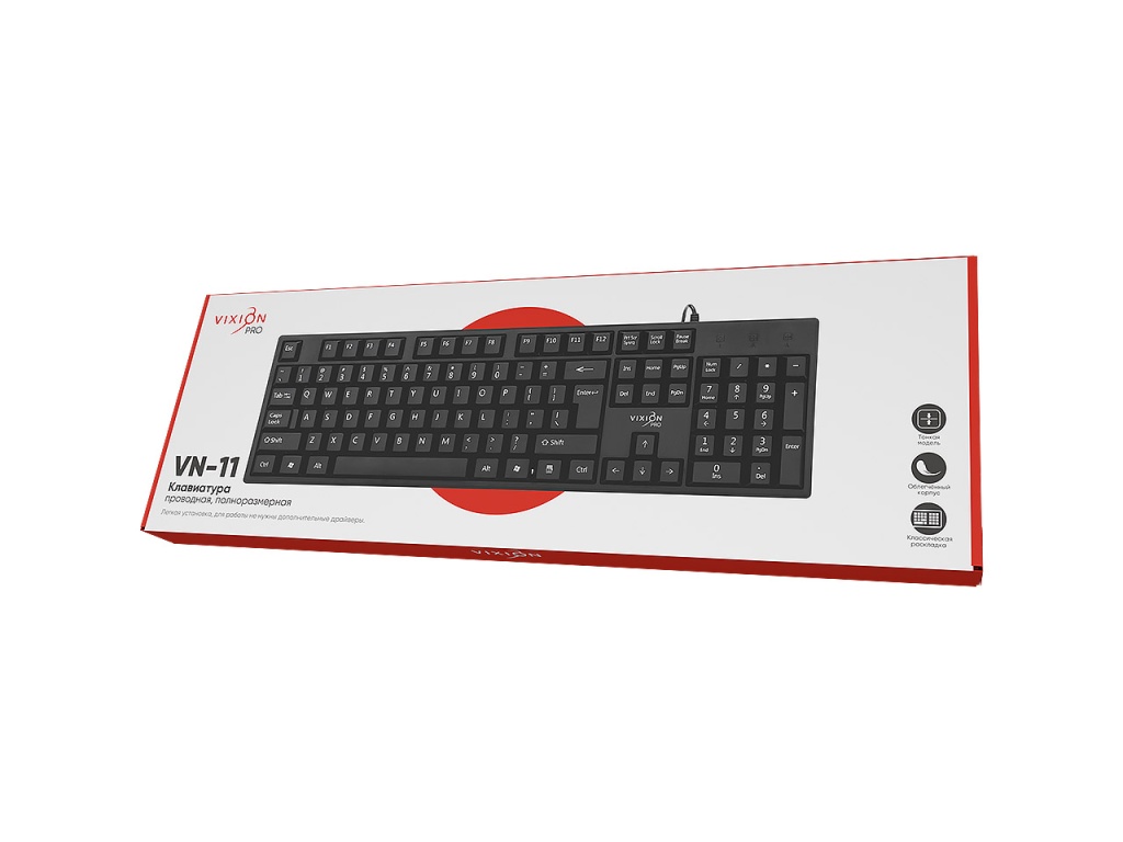 Полноразмерная проводная компьютерная клавиатура VIXION PRO VN-11 предназначена для ввода символов и команд на компьютере или ноутбуке, является координатным устройством. Клавиатура имеет классическую раскладку, в конструкции 104 клавиши и цифровой блок, используется мембранный механизм нажатия клавиш. Выполнена в современном неоклассическом стиле с облегченным тонким пластиковым корпусом черного цвета. Клавиатура проста в установке, достаточно присоединить ее к компьютеру или ноутбуку, и можно приступать к работе. VIXION PRO VN-11 отлично подойдет как для офиса, так и для дома, работать с ней одно удовольствие. Питание устройства осуществляется за счет 1.45-метрового USB-кабеля. Модель совместима с Windows95/98/2000/XP/Vista/7/8/10.