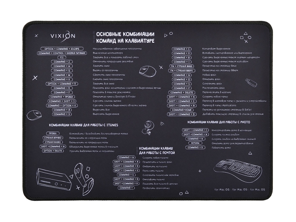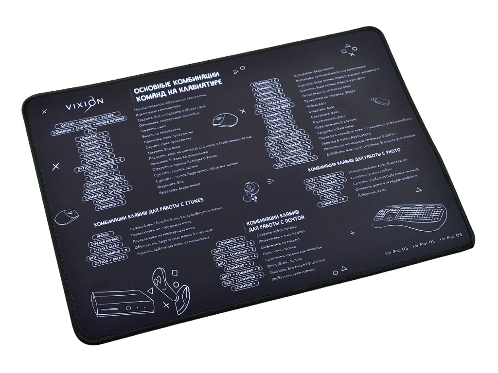 Коврик для мыши Vixion MP14 подходит для удобной навигации в программах и играх, позволит достичь высокой точности в управлении игровым и рабочим процессом. Стильный дизайн аксессуара, с принтом «Раскладка для Mac OS», украсит интерьер любого рабочего места. Гладкая прочная ткань коврика обеспечит идеальное скольжение и мгновенный отклик на любые команды, нижний резиновый слой делает его устойчивым даже при интенсивных манипуляциях, а прошитые края повышают долговечность аксессуара. Совместим с оптическими, оптико-механическими и лазерными мышками. Удобен в эксплуатации и прост в уходе. Размер — 350x250x3 мм.