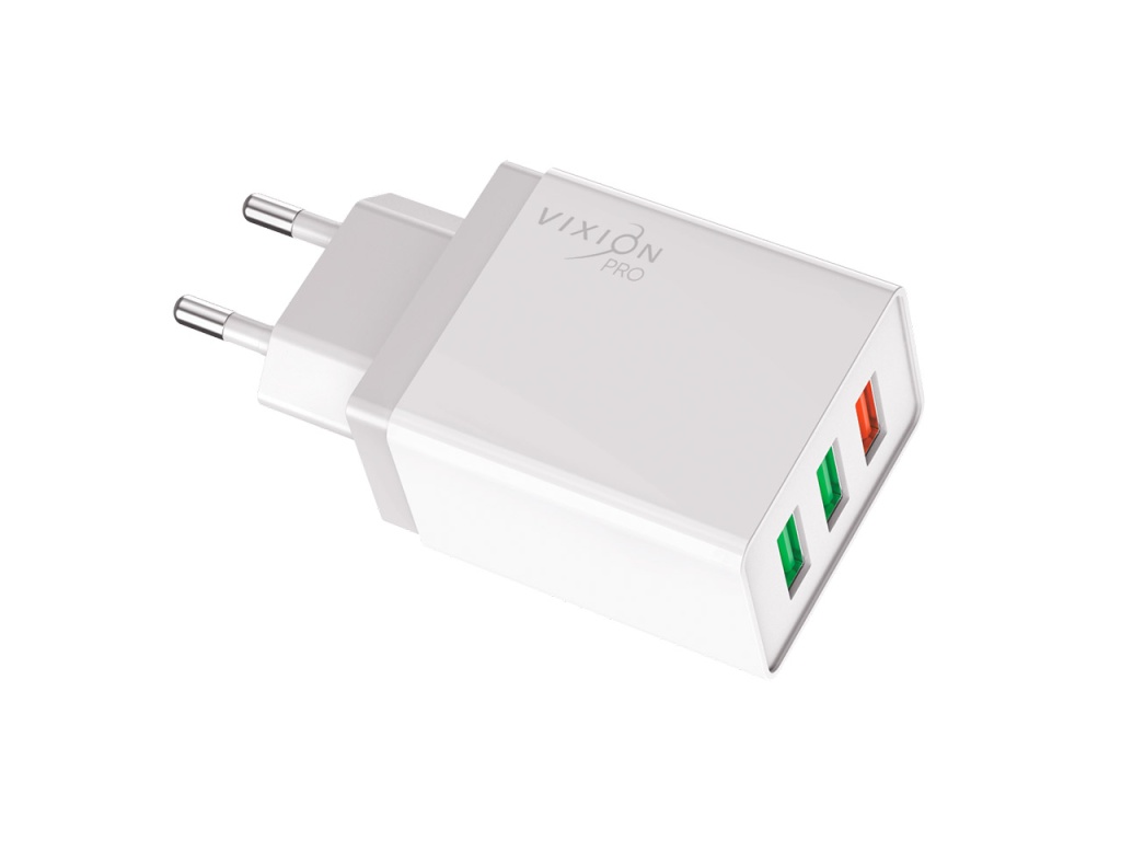 СЗУ VIXION PRO VH-03 создано для ежедневного использования. Изготовлено из качественного белого полипропилена, имеет 3 USB-входа. Обладает надежностью корпуса и долговечностью контактов, устойчивостью к вылетам из розеток, стильным внешним видом. Есть функция быстрой зарядки.