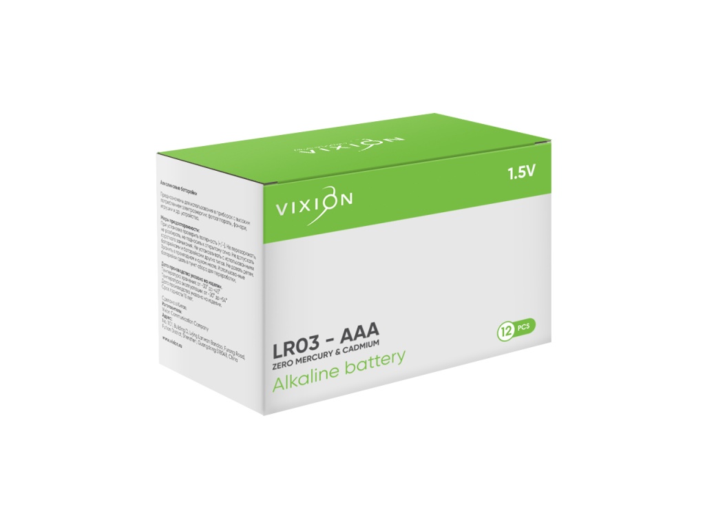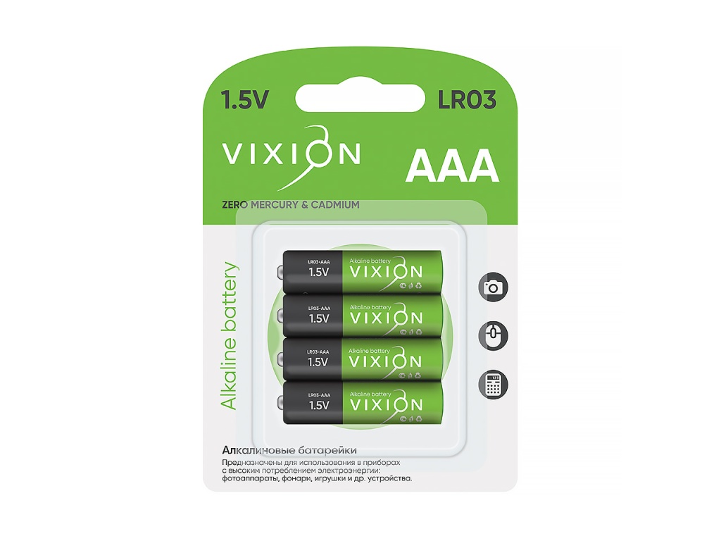 Функционируют даже при низких и высоких температурах, их режим работы от -20 до +54 С°. Батарейки Vixion LR03 оснащены плотным ядром из высокоочищенного цинка, что позволяет поместить в них больше энергии и использовать дольше других. Для снижения коррозии их покрывают никелированной сталью. Алкалиновые батарейки имеют надёжную герметизацию, конструкция разработана для предотвращения взрыва.