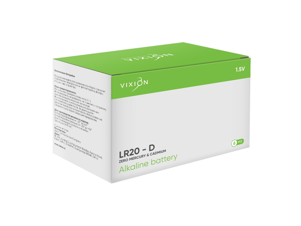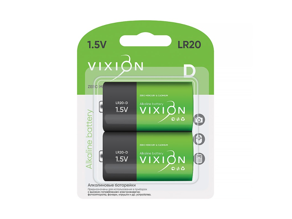 Функционируют даже при низких и высоких температурах, их режим работы от -20 до +54 С°. Батарейки Vixion LR20 оснащены плотным ядром из высокоочищенного цинка, что позволяет поместить в них больше энергии и использовать дольше других. Для снижения коррозии их покрывают никелированной сталью. Алкалиновые батарейки имеют надёжную герметизацию, конструкция разработана для предотвращения взрыва.