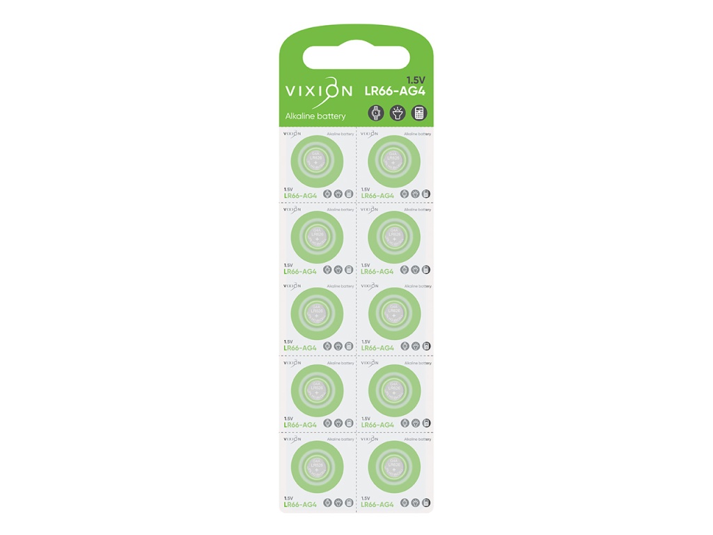 Алкалиновые батарейки Vixion LR66 подойдут для электронной техники компактных размеров: лазерных указок, градусников, детских игрушек, калькуляторов, наручных часов, автономных датчиков, электронных весов и других устройств. По своей форме элемент питания напоминает таблетку, относится к щелочным батарейкам. При своем небольшом размере изделие имеет высокие технические характеристики и отличные показатели энергоемкости, а малый коэффициент саморазряда позволит батарейке прослужить долгое время.