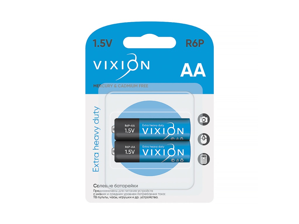 Солевые батарейки Vixion R6P подходят для простейших электронных устройств с малым и умеренным потреблением тока: маленьких приёмников, карманных фонариков, простых электронных часов, пультов дистанционного управления, тестеров и других устройств. Основные преимущества перед алкалиновыми батарейками – ценовая доступность и легкий вес. Выполнены в корпусе цилиндрической формы, с напряжением в полтора вольта, относятся к типа АА. Элемент питания легко прослужит месяцы, а то и годы маломощному устройству. Покой и отдых продлевает срок эксплуатации батарейки этого типа, а если потрясти или даже постучать об руку, то их можно реанимировать (разравниваются комки электролита, и батарейки способны еще немного прослужить).