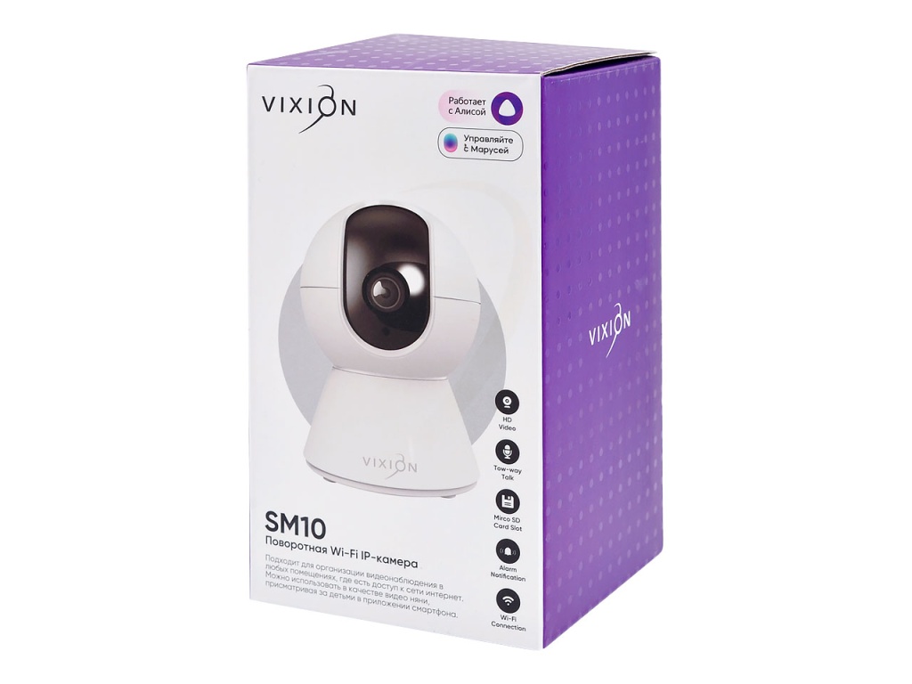 Поворотная IP-камера Vixion SM10 подходит для организации видеонаблюдения в любых помещениях, где есть доступ к сети интернет. Можно использовать в качестве видеоняни, присматривая за детьми в приложении смартфона. Благодаря наличию микрофона и динамика камера поддерживает двустороннюю аудиосвязь. Камерой легко управлять через приложение Vixion Home, а хранить записи можно на сервере или на карте памяти (в комплект не входит), камера поддерживает формат MicroSD до 128 Гб. Цвет устройства – белый. Камера укомплектована адаптером и проводом питания, крепежами для монтажа, инструкцией.