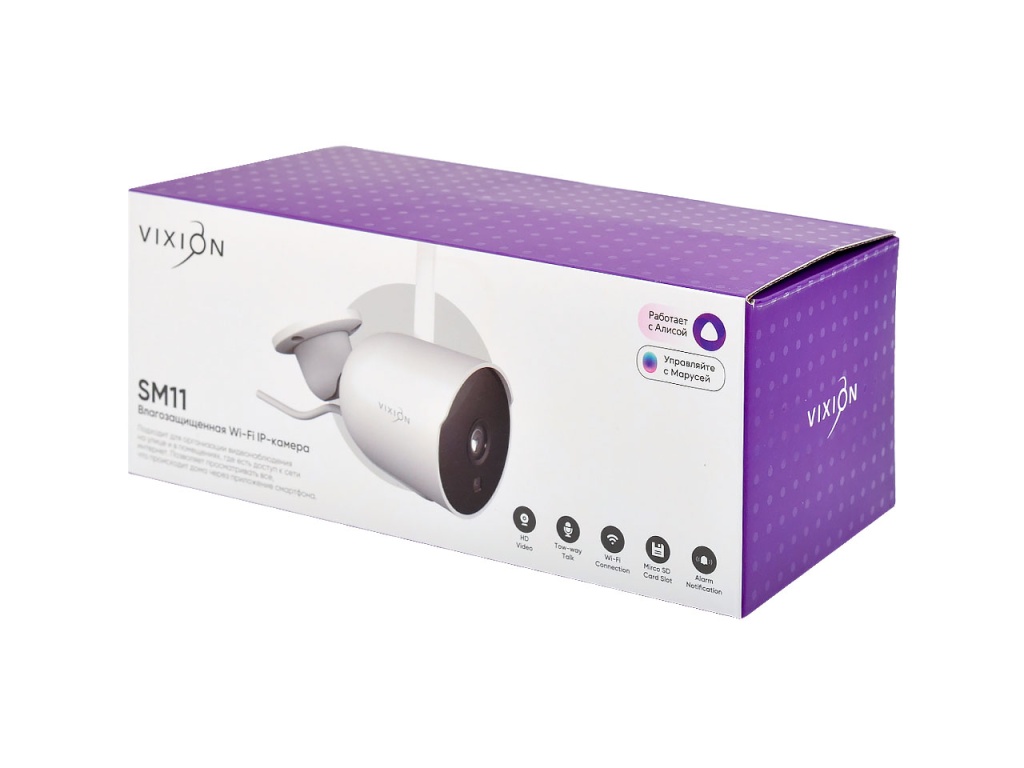 Влагозащитная IP-камера Vixion SM11 подходит для организации видеонаблюдения на улице и в помещениях, где есть сеть интернет. Модель представлена в белом пластиковом корпусе. IP-камера SM11 с матрицей 2 Мп позволяет получить качественное видео с разрешением FullHD 1080p. Обладает защитой IP66, может работать при высокой влажности, температуре до 60°C. Управление камерой осуществляется через приложение Vixion Home. На корпусе предусмотрен встроенный микрофон и динамик. Архив записей можно хранить на сервере или на карте памяти (в комплект не входит), камера поддерживает формат MicroSD до 128 Гб. Подходит для дневной и ночной съемки, с дальностью подсветки 20 м. Камера укомплектована адаптером, крепежами для монтажа и инструкцией.