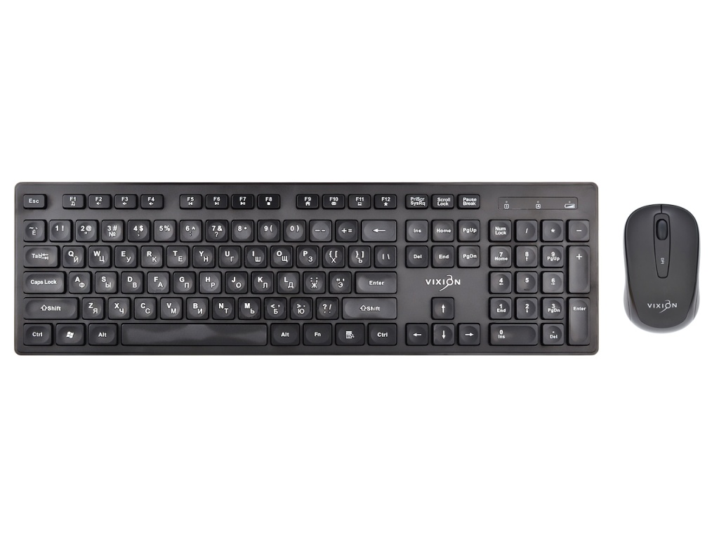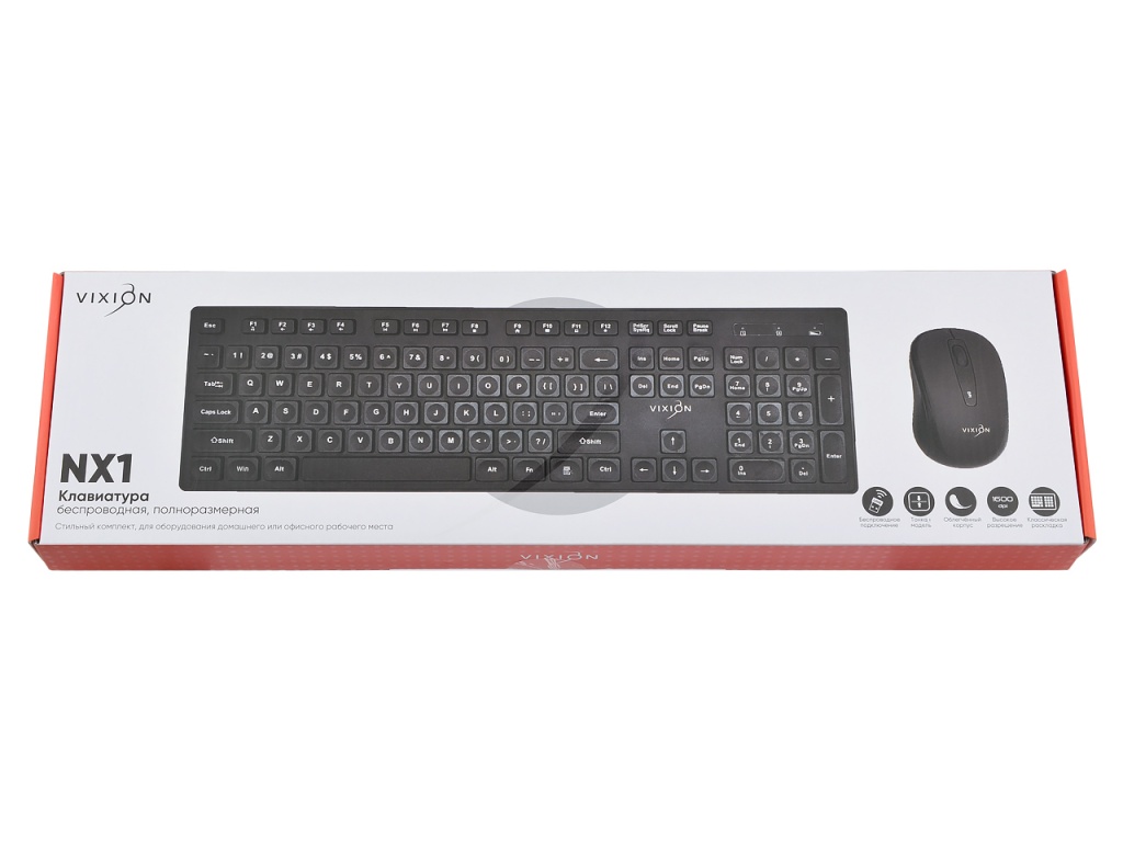 Беспроводной набор VIXION NX1 - стильный комплект для оборудования домашнего и офисного рабочего места. В него входит полноразмерная беспроводная компьютерная клавиатура и беспроводная оптическая мышь. Комплект предназначен для ввода символов и команд на компьютере или ноутбуке. Клавиатура выполнена в облегченном современном пластиковом корпусе черного цвета, имеет классическую раскладку, в конструкции предусмотрены 104 клавиши и цифровой блок. Компьютерная мышь выполнена из качественного черного пластика, оснащена 4 кнопками, поддерживает разрешение 800,1200,1600 dpi. Беспроводные клавиатура и мышь имеют простую установку и не требуют дополнительных драйверов, достаточно присоединить ресивер (2.4ГГц) к компьютеру или ноутбуку.