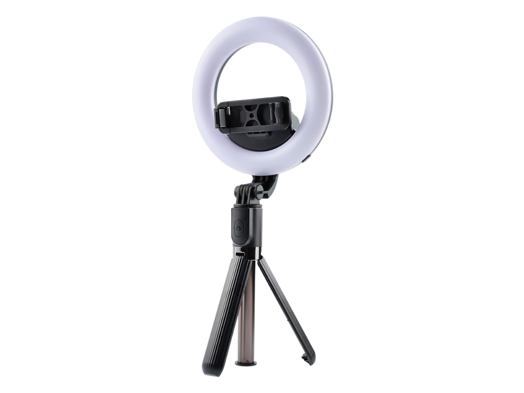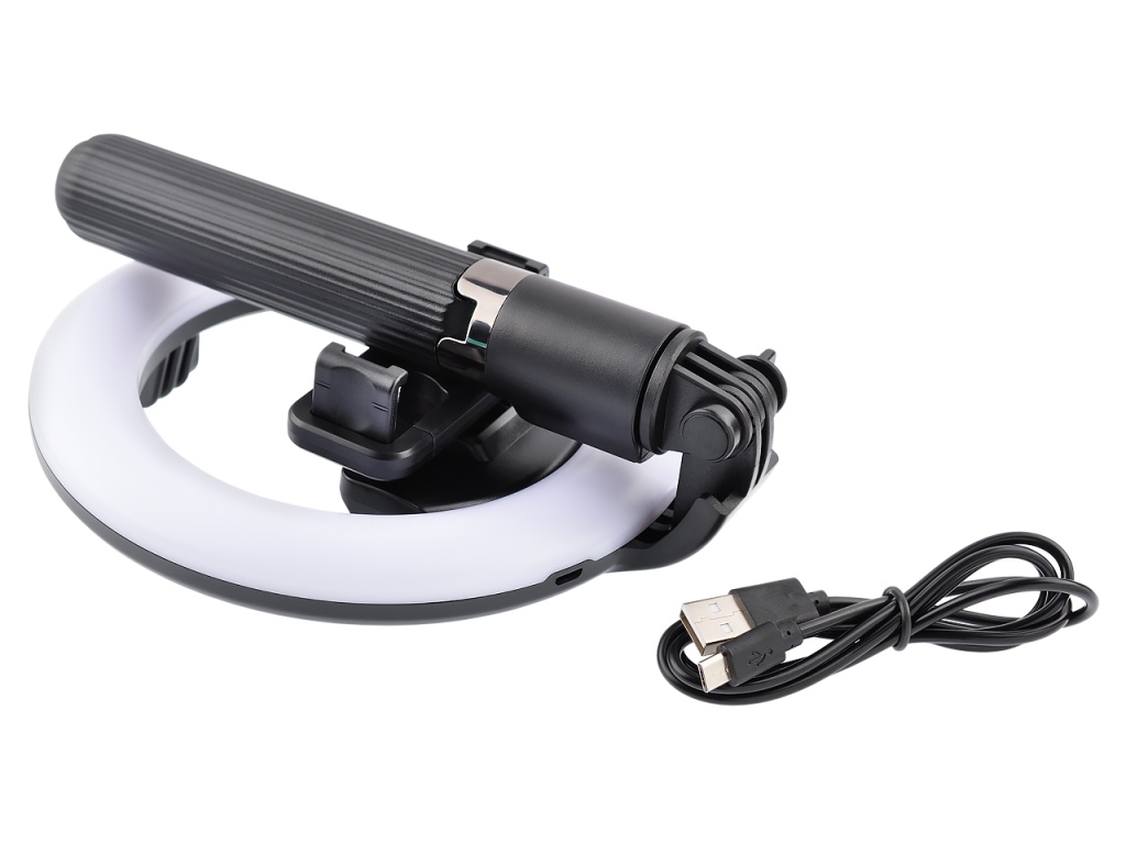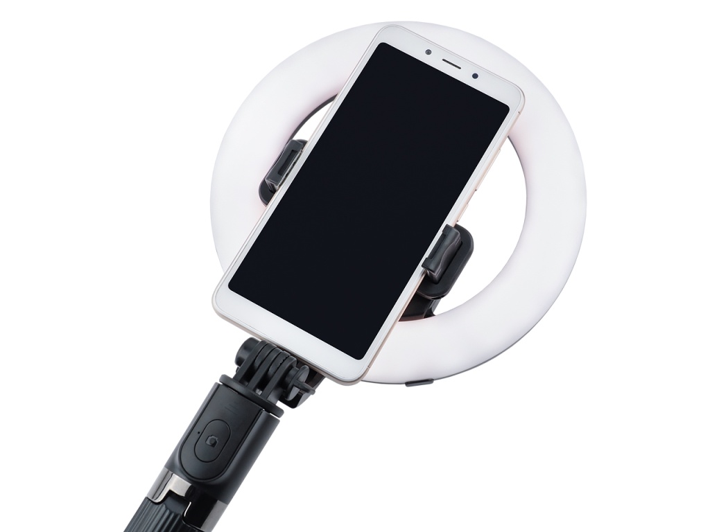 Многофункциональное устройство может вращаться на 360°. Компактный размер (19 см) и небольшой вес (280г) позволяет брать селфи лампу с собой в поездки. Устройство подходит для Android 4.2.2 и iOs 5.0 и выше. Освещение имеет 3 режима и 3 степени яркости (в каждом из режимов), поэтому можно выбрать наилучший вариант света для качественной фото/видеосъемки. Подключается через Bluetooth с версией 4.1.
