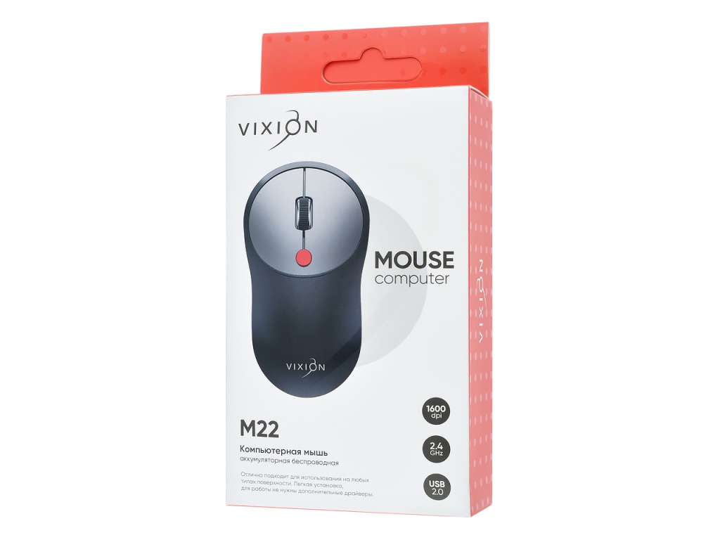 Беспроводная мышь VIXION M22 — механический манипулятор, подойдет для работы с компьютером/ноутбуком, удобно пользоваться дома и в офисе. Компактная беспроводная модель не ограничивает движения. Красная кнопка на мыши позволит выбрать оптимальный режим разрешения, который равняется 800 dpi,1200 dpi, 1600 dpi. Модель VIXION M22 имеет лаконичный черный цвет корпуса, с серебряными кнопками. Мышь удобно держать, она не выскальзывает и не напрягает руки. Рабочая дистанция —10 м. Работает на аккумуляторе.