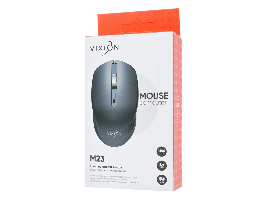 VIXION M23 — беспроводная аккумуляторная мышь, станет надежным помощником в работе с компьютером дома и в офисе. Компактная беспроводная модель не ограничивает движения. Мышь VIXION M22 выполнена в черном цвете, оснащена кнопкой смены режима разрешения (800 dpi,1200 dpi,1600 dpi) и удобным колесиком для пролистывания страниц. Мышь не скользит и не напрягает руки. Рабочая дистанция — 10 м.