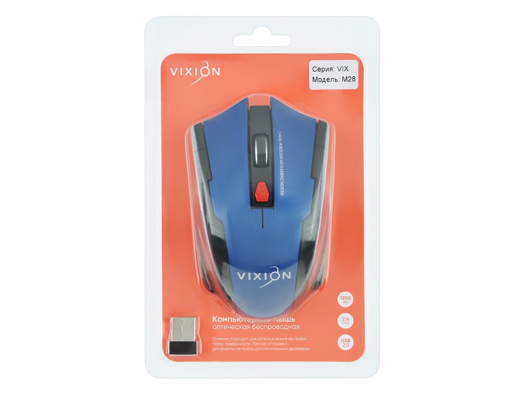 Компьютерная беспроводная мышь VIXION M28 обеспечит комфортную работу за ноутбуком/компьютером. Модель подключается через USB-ресивер, который идет в комплекте. Выполнена из качественного черного полимера с синими вставками, имеет рифлёное колесо для прокрутки и 2 боковые клавиши (вверх—вниз). Верхняя кнопка DPI поможет вам подобрать оптимальный и удобный режим разрешения, одно нажатие на нее и курсор перемещается немного быстрее. Мышь удобно лежит в руке, этому способствует эргономическая форма корпуса. Аксессуар питается от ААА батареек, связывается с устройством через радиочастоты 2,4 гГц.