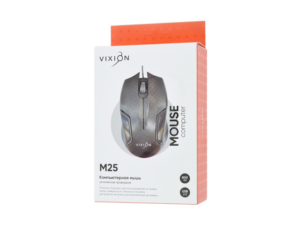 Стильная черная проводная компьютерная мышь VIXION M25 подходит для работы с системами Windows 2000/XP/Vista/7/8/10, Mac OS X10. Ее эргономический корпус удобно лежит в руке как правши, так и левши. Рифленое колесико помогает с легкостью пролистывать страницы на экране. Аксессуар обладает чувствительностью сенсора в 800 dpi. С помощью встроенного USB-кабеля устройство легко подключается к USB-порту компьютера или ноутбука.