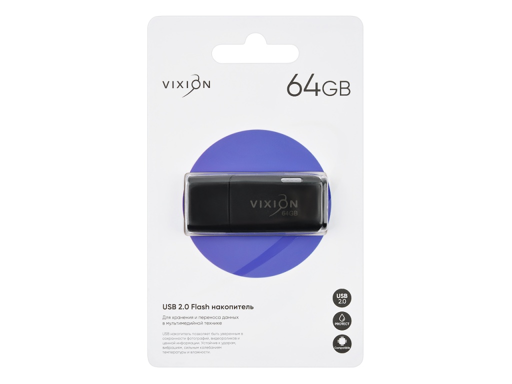 Flash-накопитель портативен, имеет функцию защиты от воды. Работает в широком диапазоне температур: от -15° до +45° С. Совместим с операционными системами Windows и Mac. Накопители VIXION изготовлены из качественных материалов, поэтому прослужат долгие годы своему обладателю.