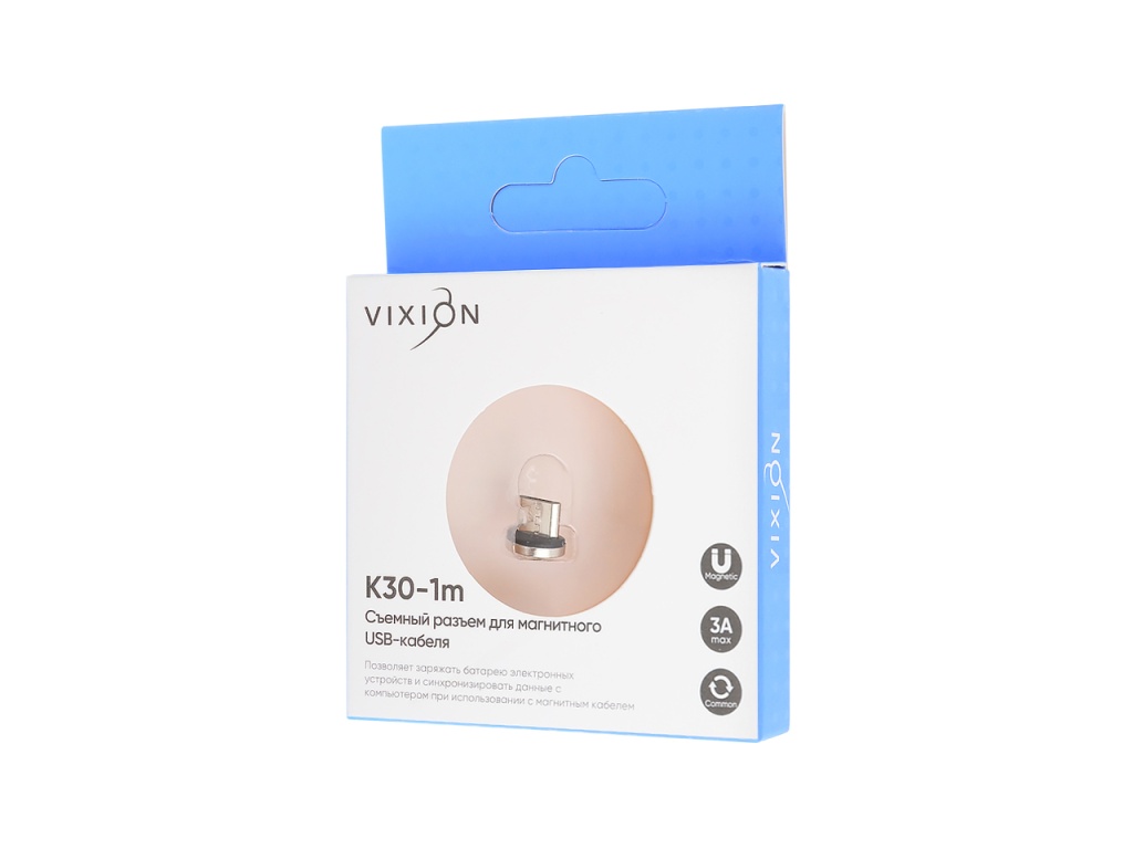 Магнитный коннектор снижает число подключений к устройству, сохраняет целостность разъема смартфона, планшета и др. Изготовлен из качественного материала, оснащен долговечным металлическим контактом. Компактная модель Vixion K30-1m плотно садится в устройство, не мешает во время его работы, защищает от капель воды, мусора и пыли. Поддерживает синхронизацию с компьютером.