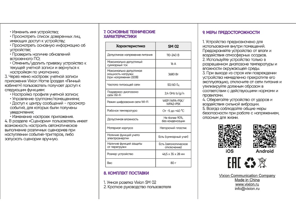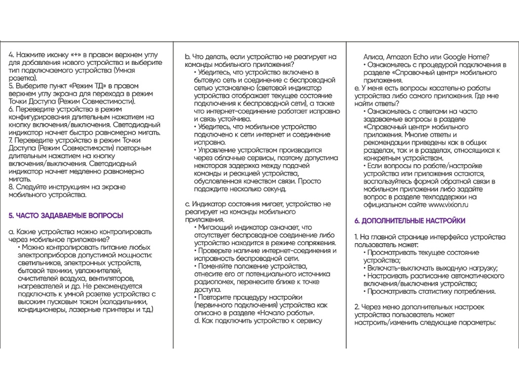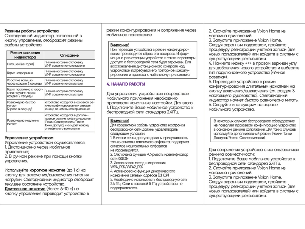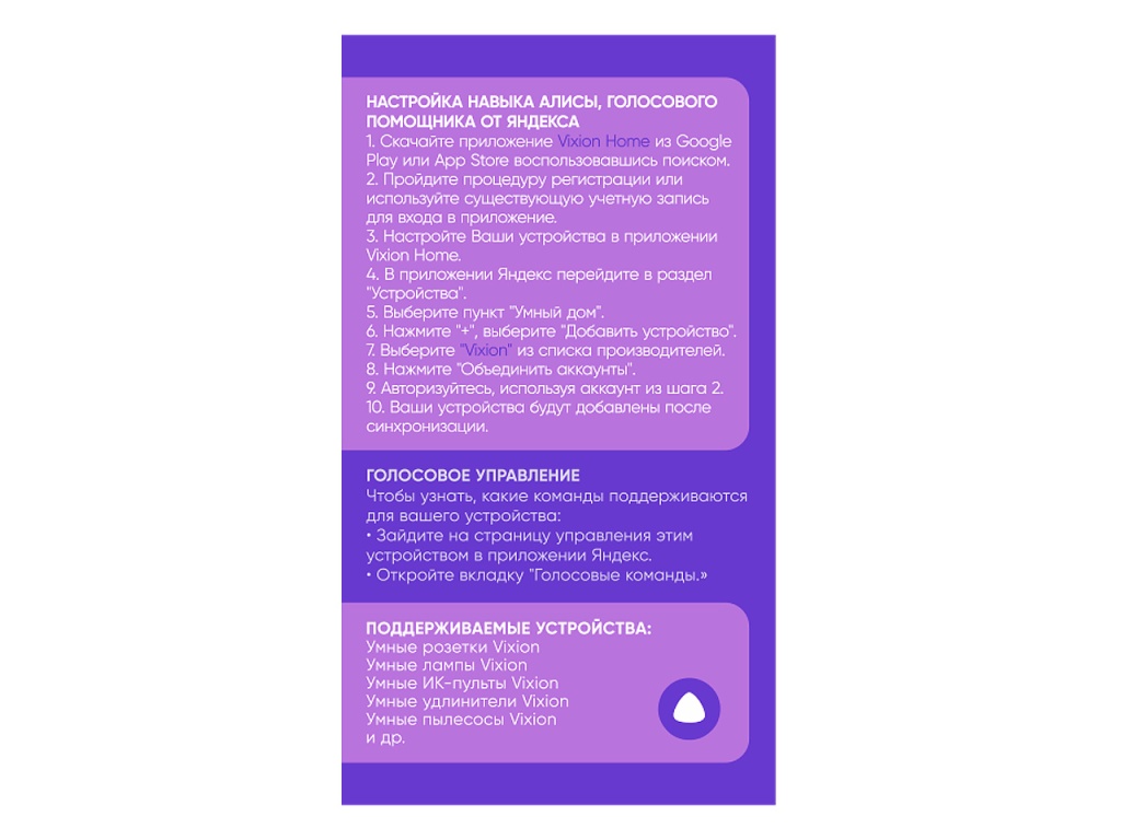 Подключите Ваше мобильное устройство к сети Wi-Fi. Скачайте приложение Vixion Home из магазина приложений вашего гаджета. Запустите приложение Vixion Home, следуя подсказкам на экране, пройдите регистрацию учетной записи или войдите в систему, если уже зарегистрированы. Для добавления устройства нажмите кнопку «+» в правом верхнем углу и выберите нужный тип устройства. Переведите устройство в режим настройки (подробные инструкции вы найдете в комплекте с розеткой), светодиодный индикатор начнет часто мигать. Следуйте инструкциям на экране мобильного устройства. После завершения настройки устройство будет готово к работе: подключится к сети, будет в системе и в списке подключенных устройств «Мои устройства». По желанию настройте голосовое управление в виртуальных помощниках.