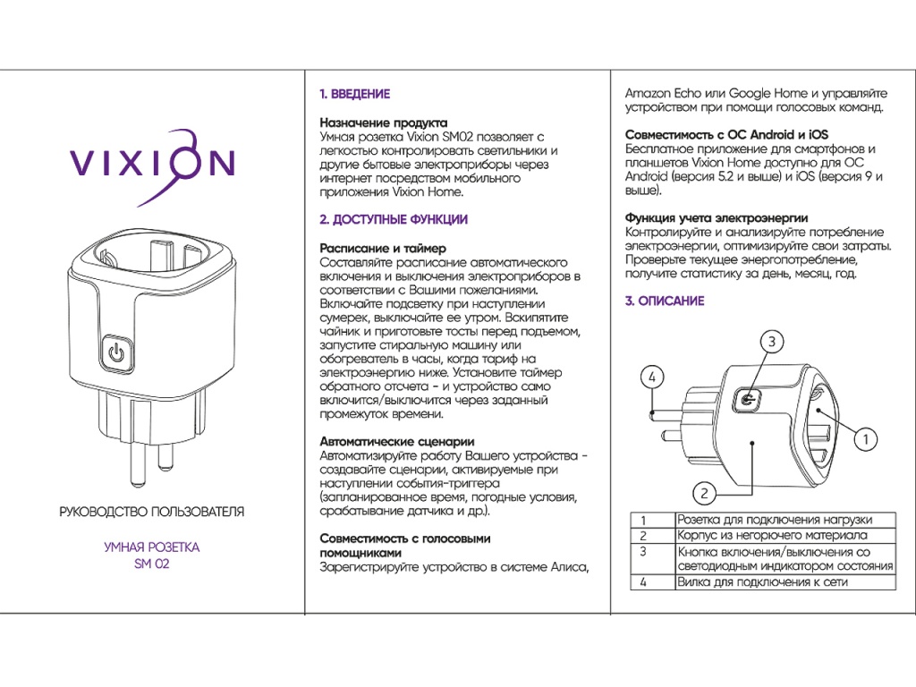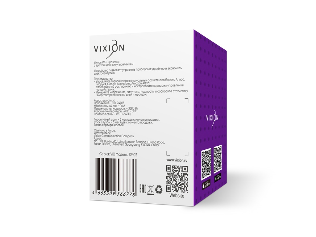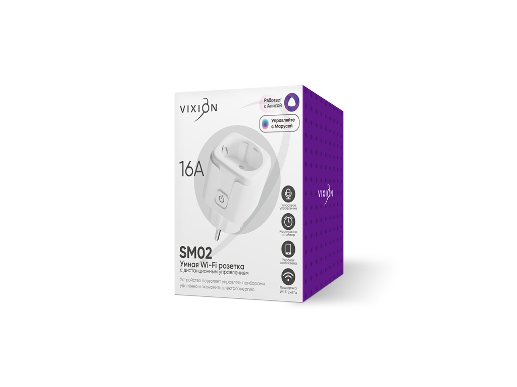 Умная Wi-Fi розетка Vixion экономит электроэнергию и помогает управлять приборами дистанционно. Представляет собой белый блок, похожий на обычную розетку, работает по системе Vixion Home. Позволяет включать/выключать подсоединенные к розетке приборы одним кликом. Управлять можно не только через мобильное приложение, но и голосовым ассистентом. Так, уходя из дома, голосовой командой вы легко можете выключить свет, сплит-систему, телевизор, утюг, печь, чайник и др. Работает в протоколе Wi-Fi 2.4 ГГц.