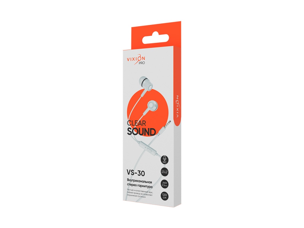 Качественная внутриканальная стереогарнитура VIXION PRO VS-30 имеет легкий белый ABS-корпус и прочный PVC аудиокабель (1,2 метра). Гарнитура оснащена кнопкой ответа. Подойдет для мобильных устройств с разъемом Jack 3,5. Диапазон воспроизводимых частот 20-20000 Гц.