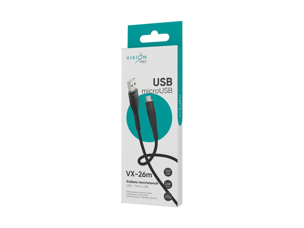Универсальный кабель VIXION PRO VX-26m обеспечит быстрый заряд синхронизацию и передачу данных цифровым устройствам с разъемом MicroUSB. Оптимальная длина шнура позволит всегда брать его с собой. Гибкий текстильный кабель черного цвета прекрасно защищает от внешних воздействий и помех, а усиленная форма штекера от заломов.